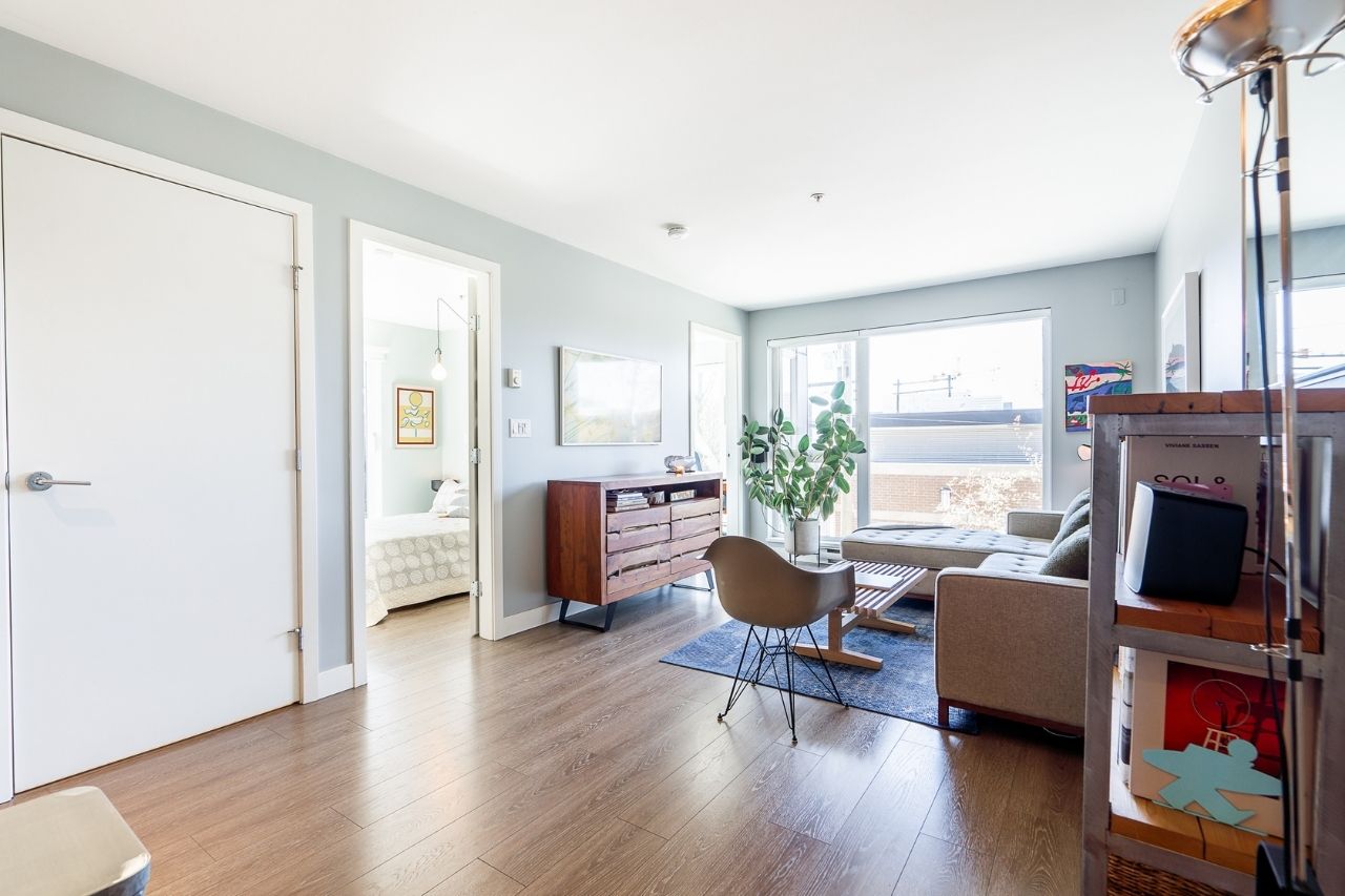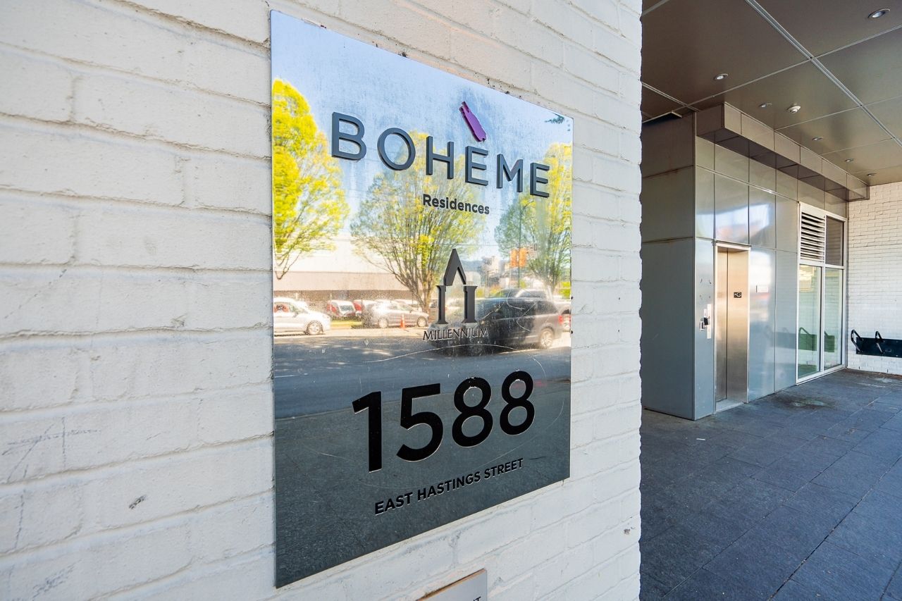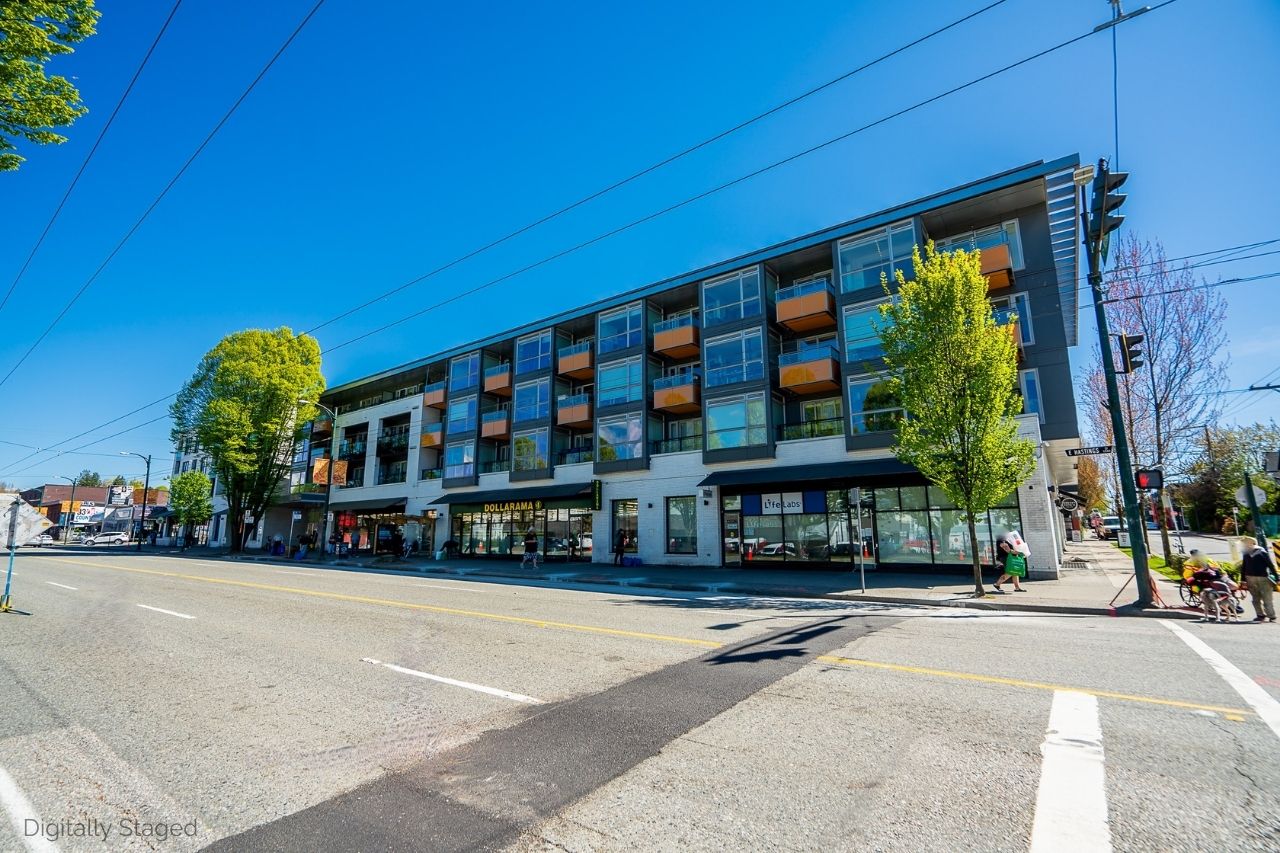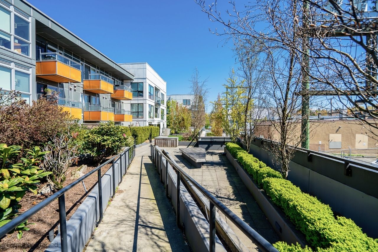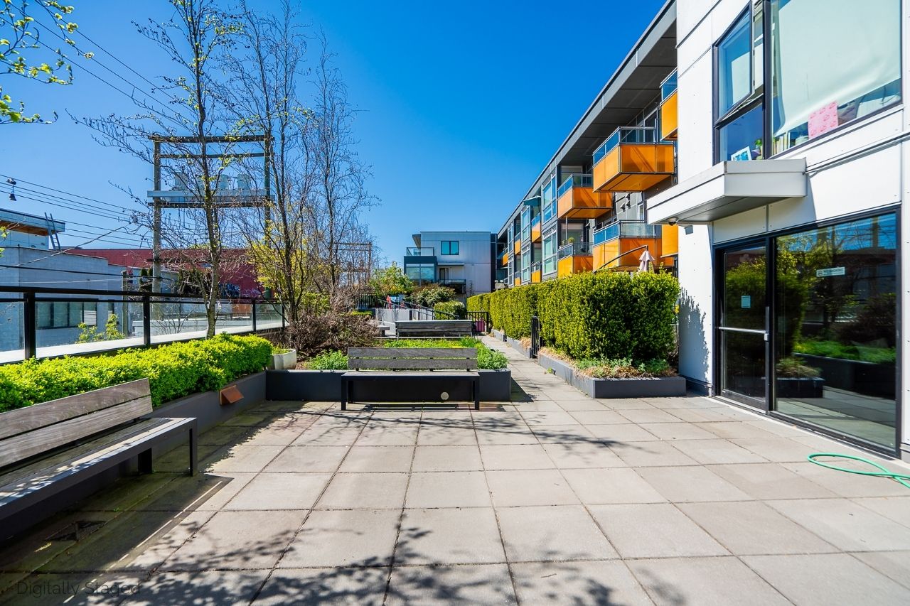 Experience the epitome of urban living in this unique 1 bed + den condo at The Boheme, nestled in vibrant East Vancouver. This corner-end unit boasts high ceilings and is located on the quiet side of the building, offering tranquility amidst the city buzz. The bright and spacious layout includes a generously sized bedroom, an office, with a partial view of the North Shore mountains that can double as a junior second bedroom, and an extra flex room. The open living and dining area seamlessly integrates with the chef's kitchen, featuring quartz countertops, integrated appliances, and modern cabinetry. Step outside to your private 214sqft sun-drenched patio which includes a mature, irrigated garden...perfect for morning coffee or evening relaxation. Enjoy the convenience of amenities such as a fitness center, party room, and outdoor courtyard with a playground. This excellent building, still under warranty, and the condo comes with secure parking and storage. Centrally located on the Mclean bike route, you're just steps away from the best restaurants, breweries, and shopping in Hastings Sunrise and Commercial Drive, offering the best value in East Vancouver's vibrant lifestyle.