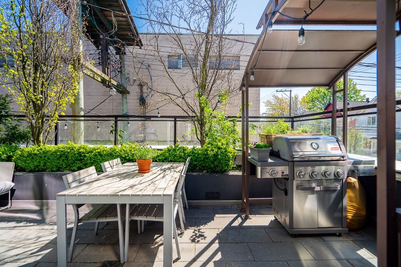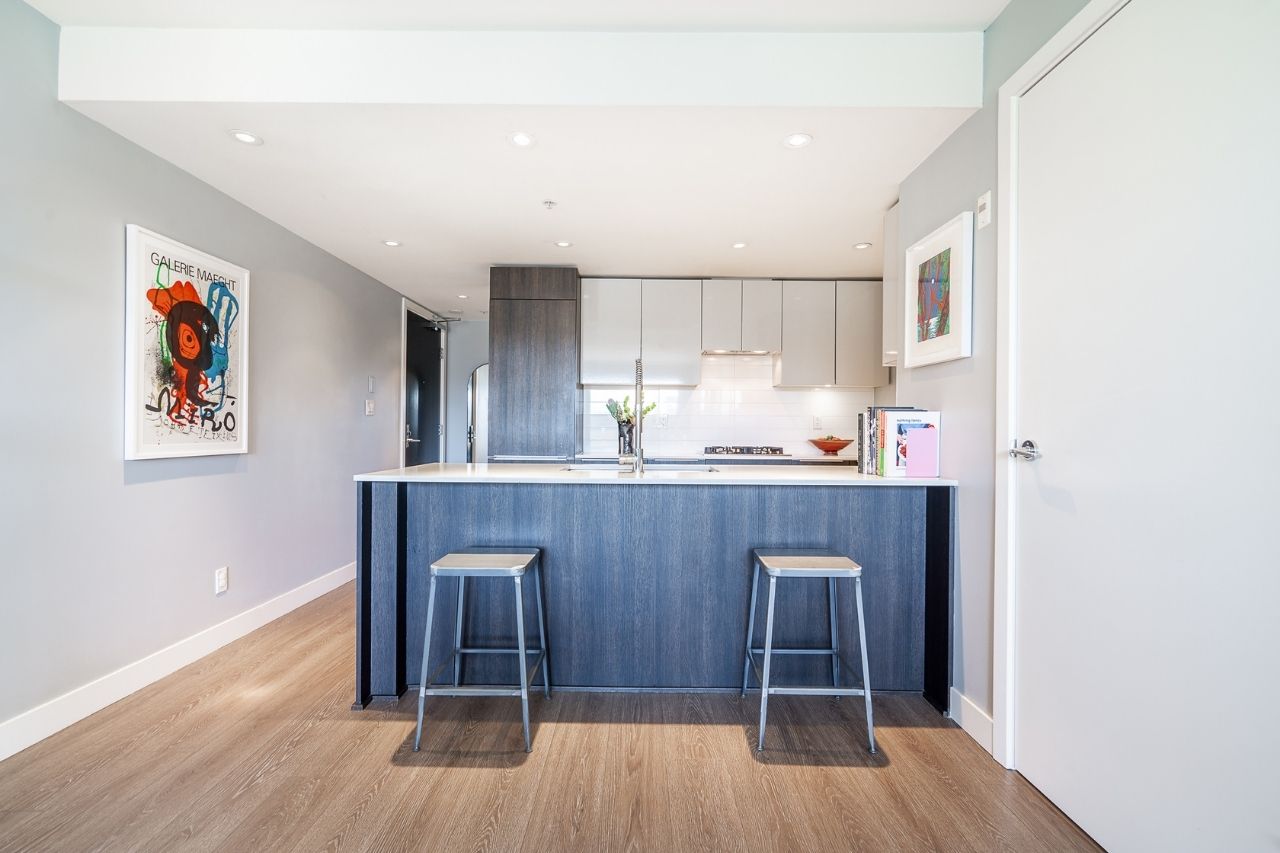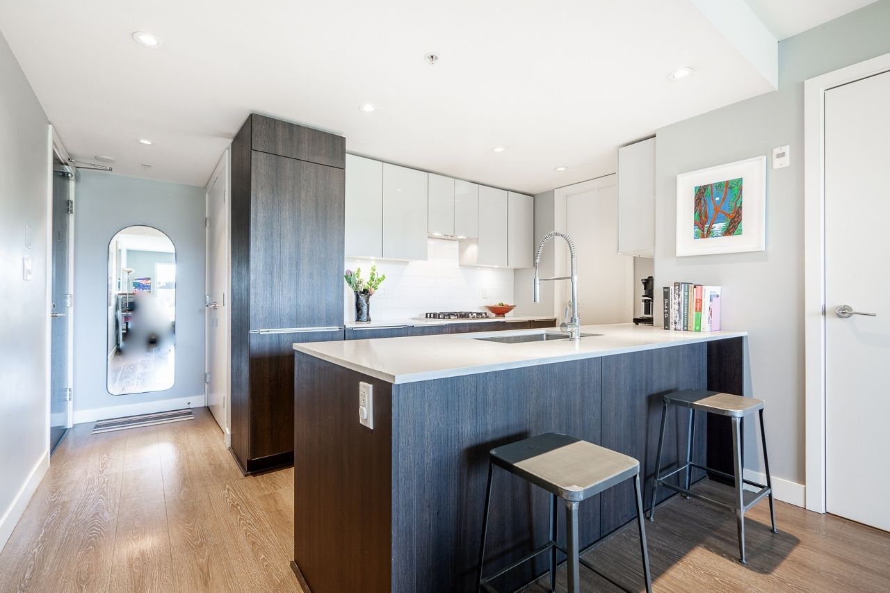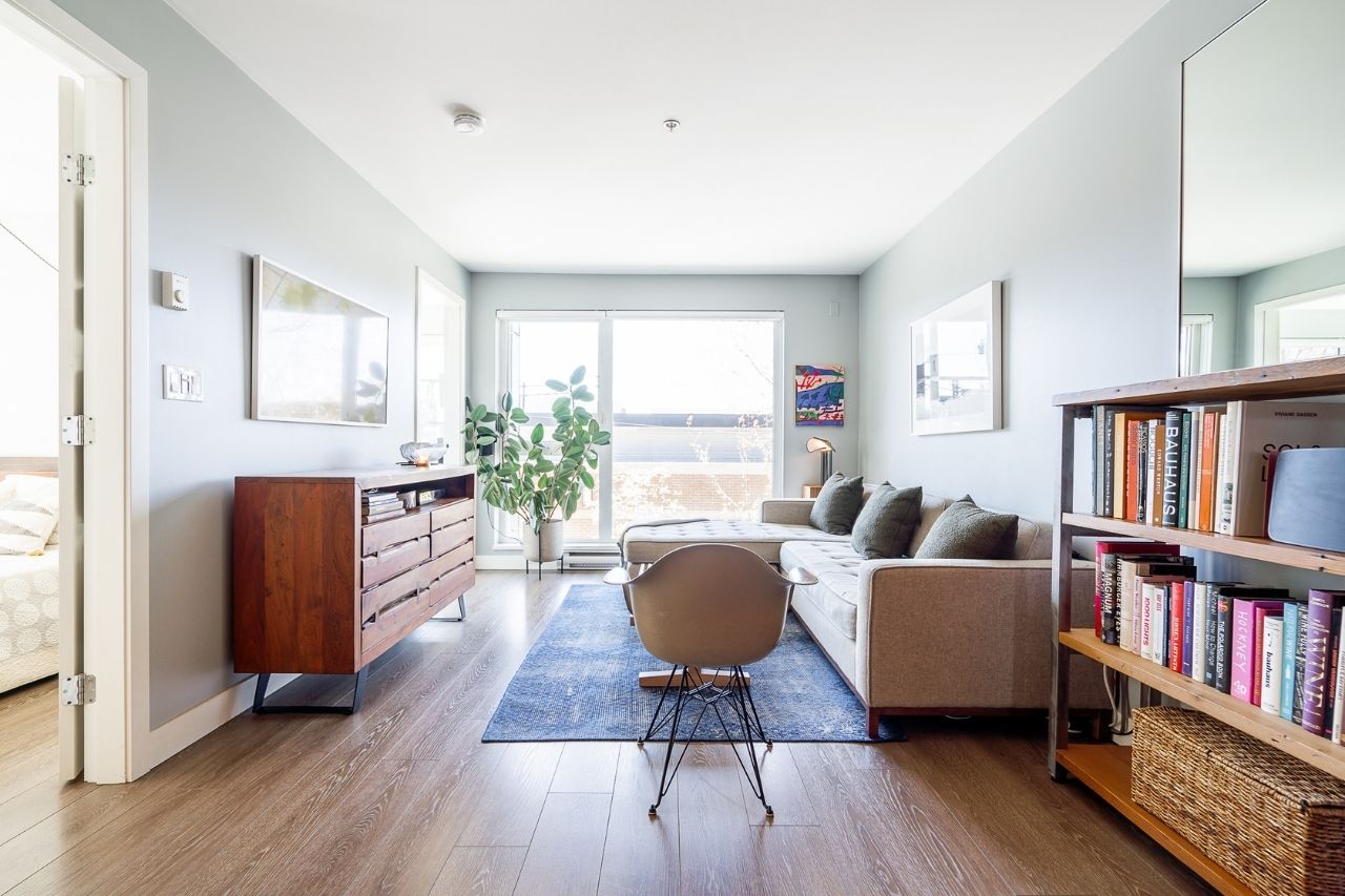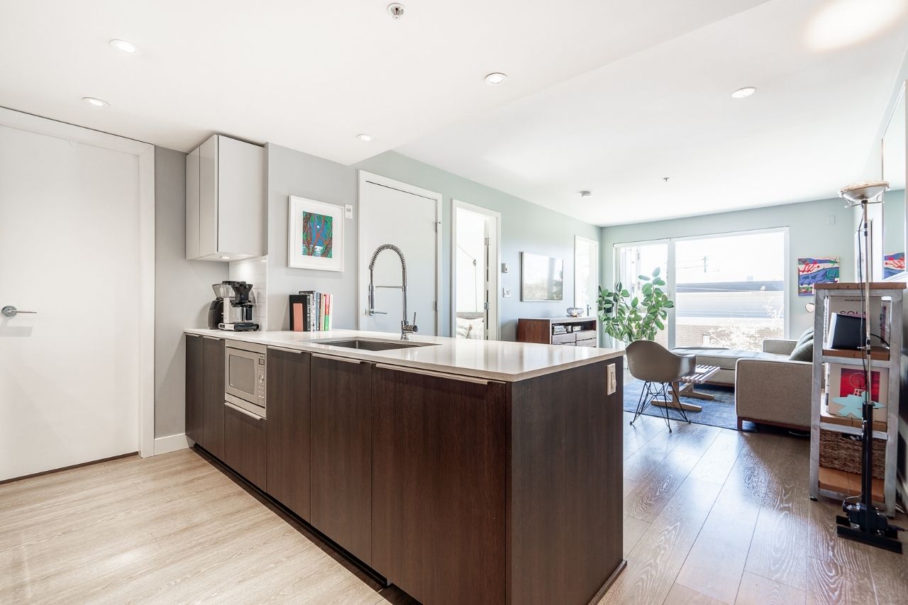 Experience the epitome of urban living in this unique 1 bed + den condo at The Boheme, nestled in vibrant East Vancouver. This corner-end unit boasts high ceilings and is located on the quiet side of the building, offering tranquility amidst the city buzz. The bright and spacious layout includes a generously sized bedroom, an office, with a partial view of the North Shore mountains that can double as a junior second bedroom, and an extra flex room. The open living and dining area seamlessly integrates with the chef's kitchen, featuring quartz countertops, integrated appliances, and modern cabinetry. Step outside to your private 214sqft sun-drenched patio which includes a mature, irrigated garden...perfect for morning coffee or evening relaxation. Enjoy the convenience of amenities such as a fitness center, party room, and outdoor courtyard with a playground. This excellent building, still under warranty, and the condo comes with secure parking and storage. Centrally located on the Mclean bike route, you're just steps away from the best restaurants, breweries, and shopping in Hastings Sunrise and Commercial Drive, offering the best value in East Vancouver's vibrant lifestyle.