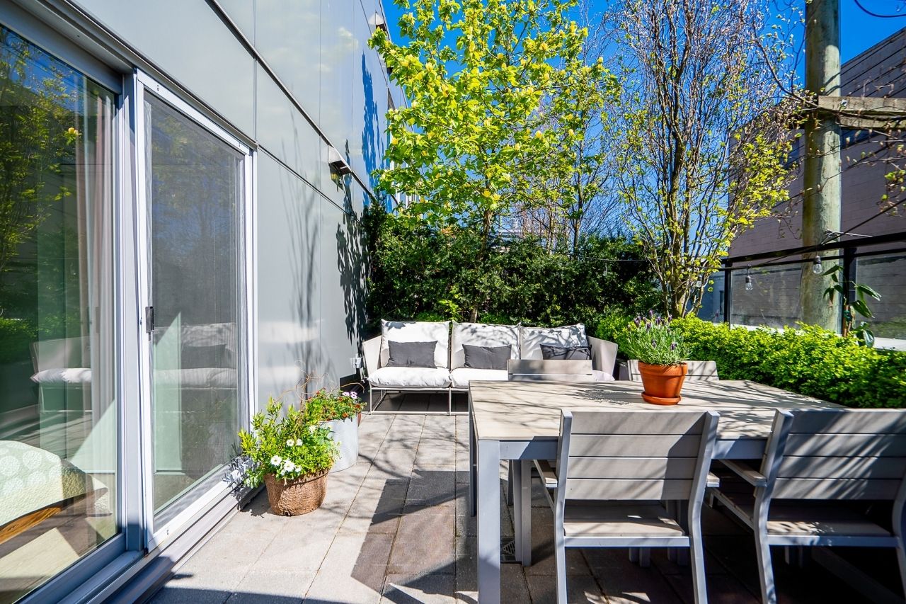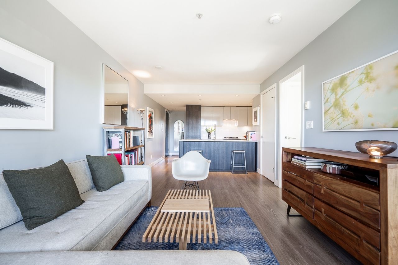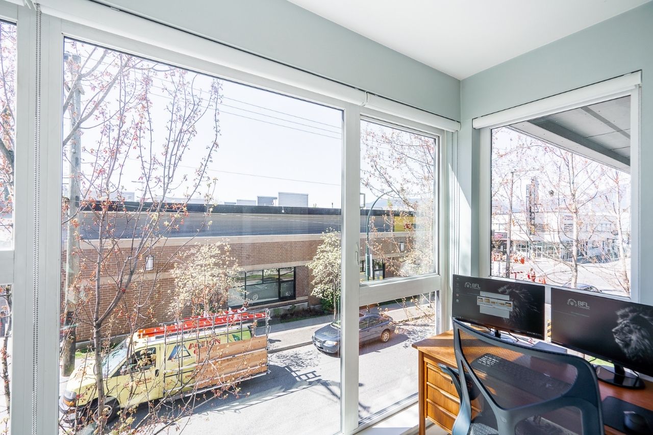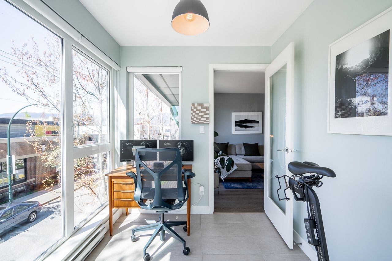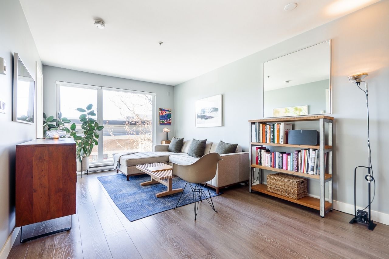 Experience the epitome of urban living in this unique 1 bed + den condo at The Boheme, nestled in vibrant East Vancouver. This corner-end unit boasts high ceilings and is located on the quiet side of the building, offering tranquility amidst the city buzz. The bright and spacious layout includes a generously sized bedroom, an office, with a partial view of the North Shore mountains that can double as a junior second bedroom, and an extra flex room. The open living and dining area seamlessly integrates with the chef's kitchen, featuring quartz countertops, integrated appliances, and modern cabinetry. Step outside to your private 214sqft sun-drenched patio which includes a mature, irrigated garden...perfect for morning coffee or evening relaxation. Enjoy the convenience of amenities such as a fitness center, party room, and outdoor courtyard with a playground. This excellent building, still under warranty, and the condo comes with secure parking and storage. Centrally located on the Mclean bike route, you're just steps away from the best restaurants, breweries, and shopping in Hastings Sunrise and Commercial Drive, offering the best value in East Vancouver's vibrant lifestyle.