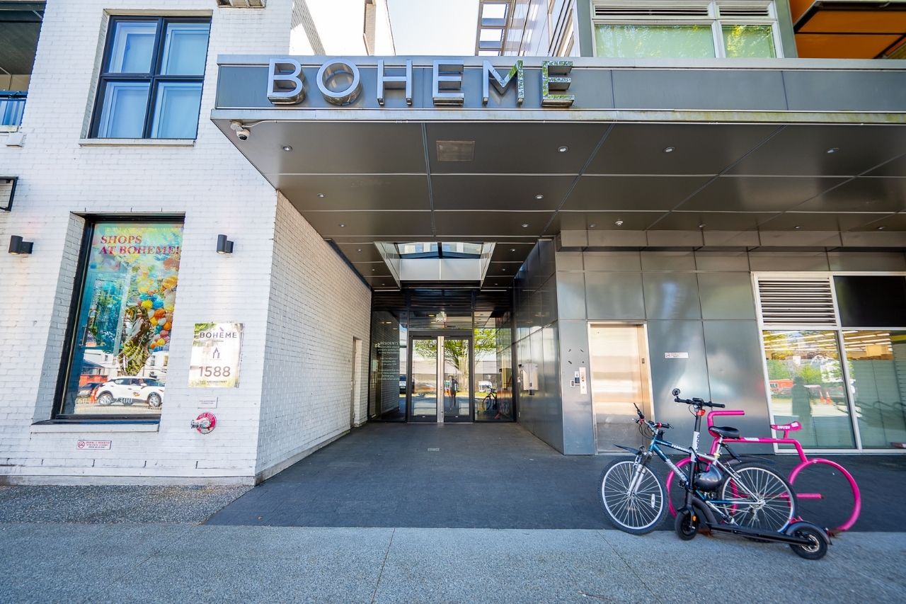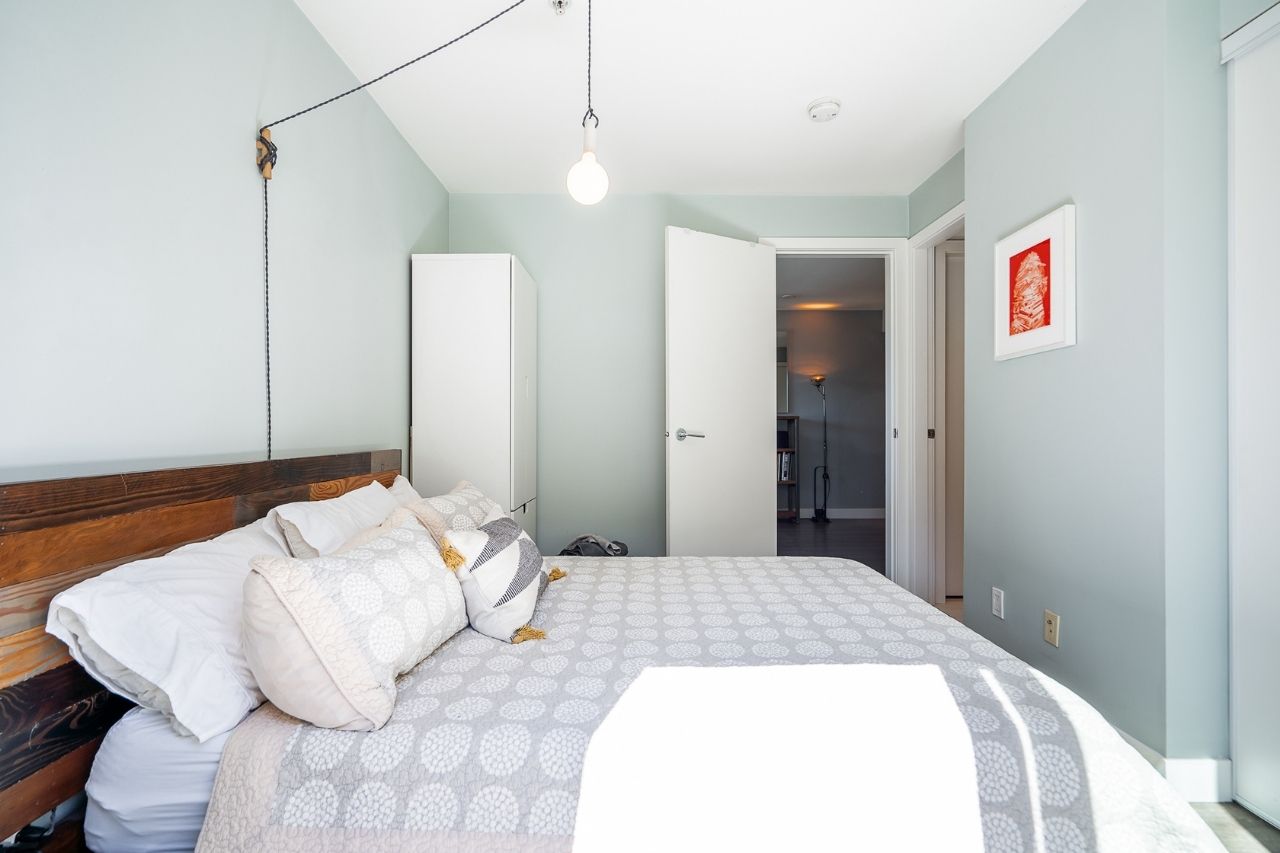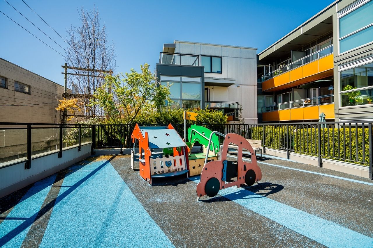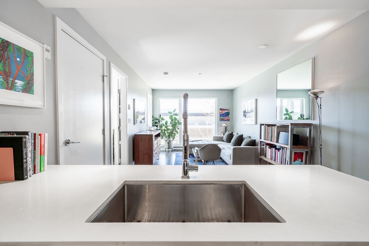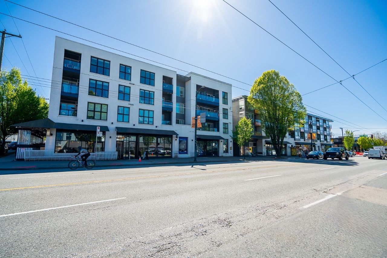 Experience the epitome of urban living in this unique 1 bed + den condo at The Boheme, nestled in vibrant East Vancouver. This corner-end unit boasts high ceilings and is located on the quiet side of the building, offering tranquility amidst the city buzz. The bright and spacious layout includes a generously sized bedroom, an office, with a partial view of the North Shore mountains that can double as a junior second bedroom, and an extra flex room. The open living and dining area seamlessly integrates with the chef's kitchen, featuring quartz countertops, integrated appliances, and modern cabinetry. Step outside to your private 214sqft sun-drenched patio which includes a mature, irrigated garden...perfect for morning coffee or evening relaxation. Enjoy the convenience of amenities such as a fitness center, party room, and outdoor courtyard with a playground. This excellent building, still under warranty, and the condo comes with secure parking and storage. Centrally located on the Mclean bike route, you're just steps away from the best restaurants, breweries, and shopping in Hastings Sunrise and Commercial Drive, offering the best value in East Vancouver's vibrant lifestyle.