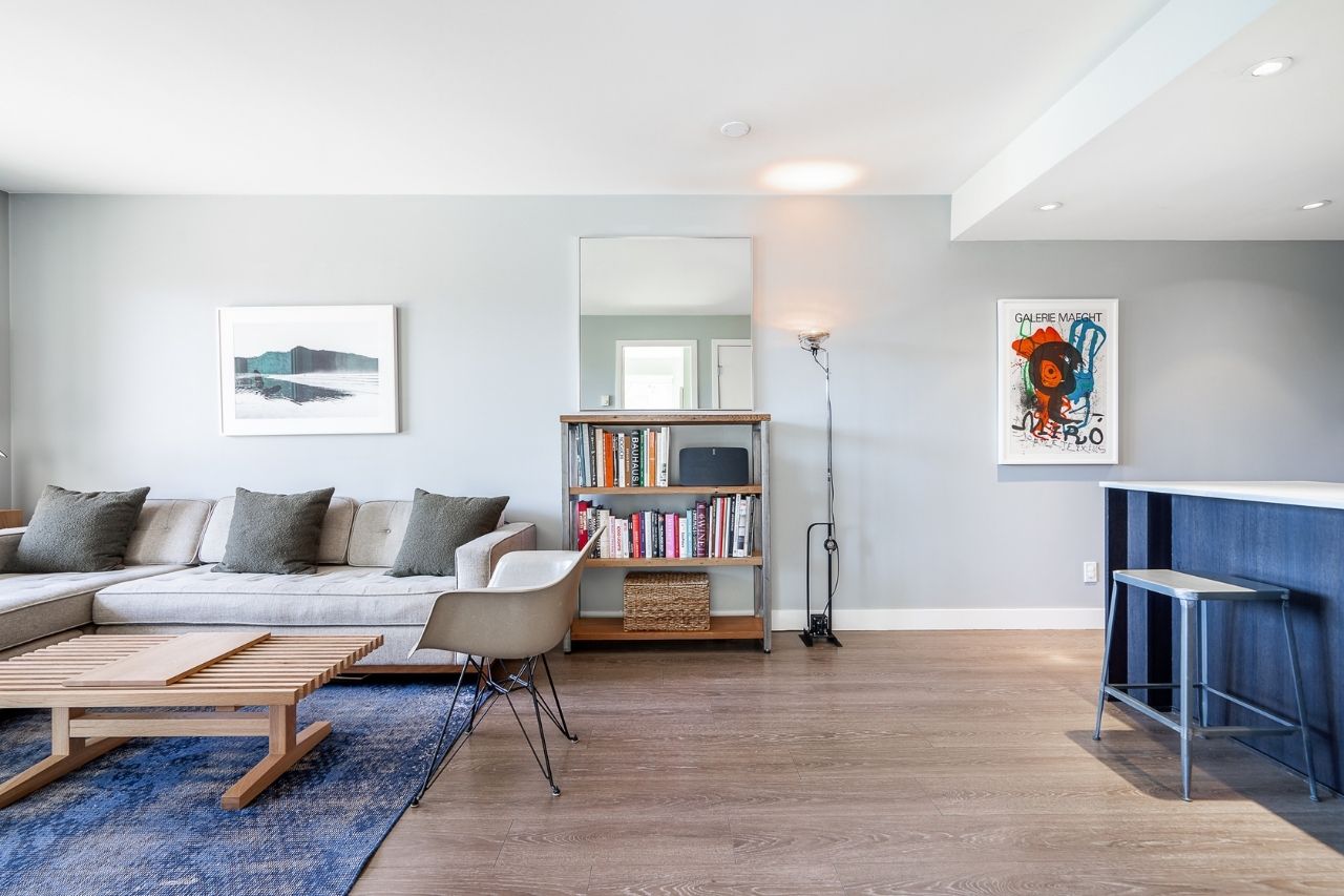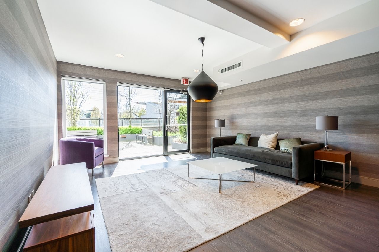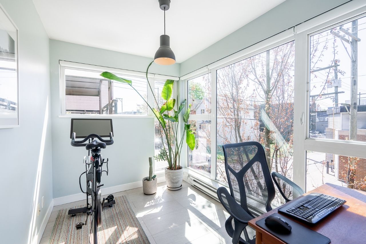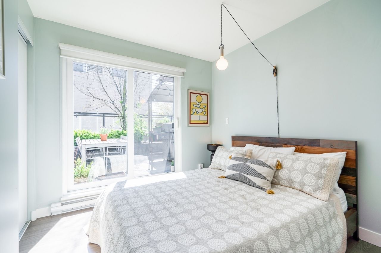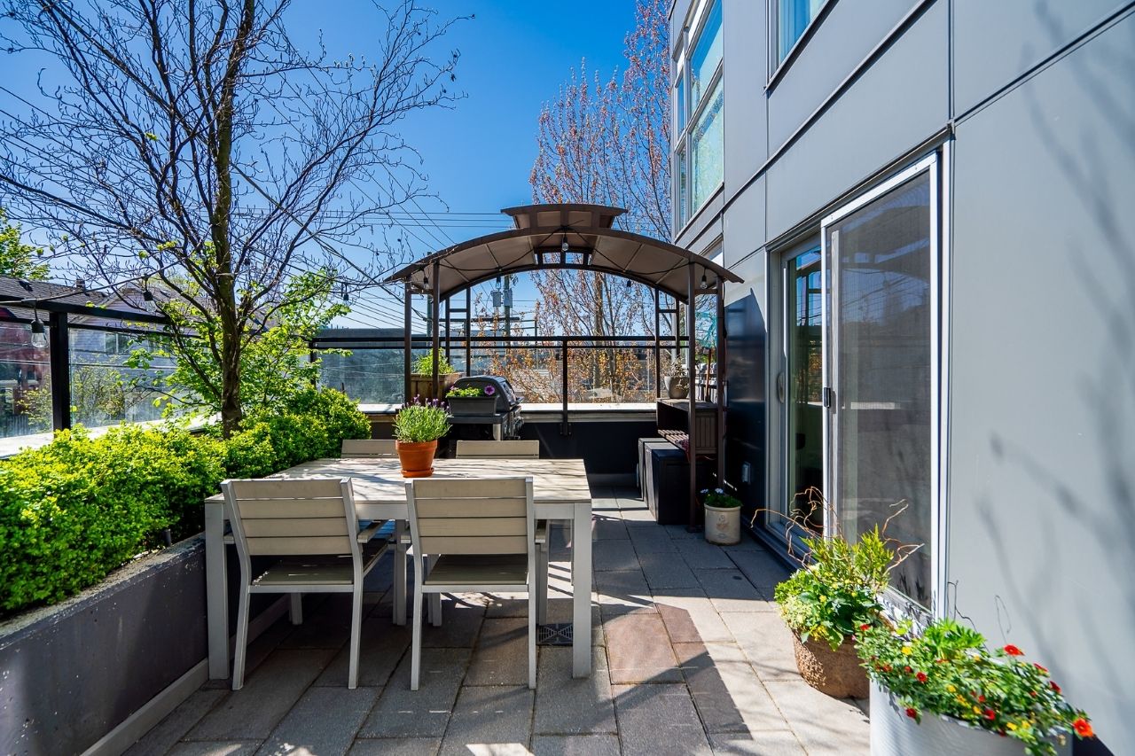 Experience the epitome of urban living in this unique 1 bed + den condo at The Boheme, nestled in vibrant East Vancouver. This corner-end unit boasts high ceilings and is located on the quiet side of the building, offering tranquility amidst the city buzz. The bright and spacious layout includes a generously sized bedroom, an office, with a partial view of the North Shore mountains that can double as a junior second bedroom, and an extra flex room. The open living and dining area seamlessly integrates with the chef's kitchen, featuring quartz countertops, integrated appliances, and modern cabinetry. Step outside to your private 214sqft sun-drenched patio which includes a mature, irrigated garden...perfect for morning coffee or evening relaxation. Enjoy the convenience of amenities such as a fitness center, party room, and outdoor courtyard with a playground. This excellent building, still under warranty, and the condo comes with secure parking and storage. Centrally located on the Mclean bike route, you're just steps away from the best restaurants, breweries, and shopping in Hastings Sunrise and Commercial Drive, offering the best value in East Vancouver's vibrant lifestyle.