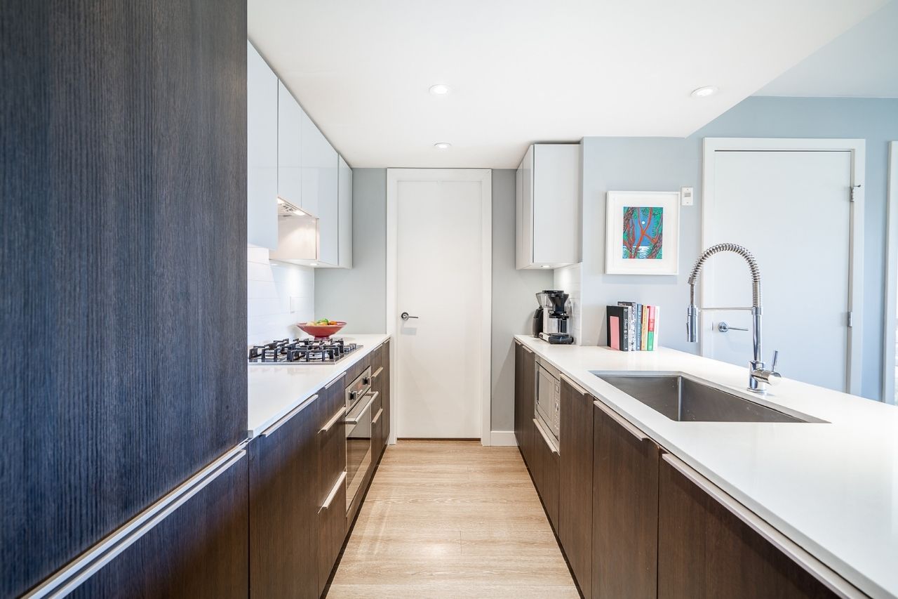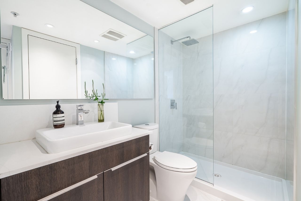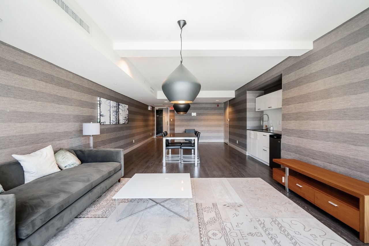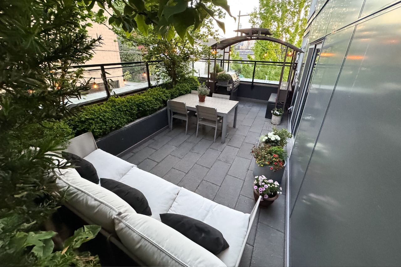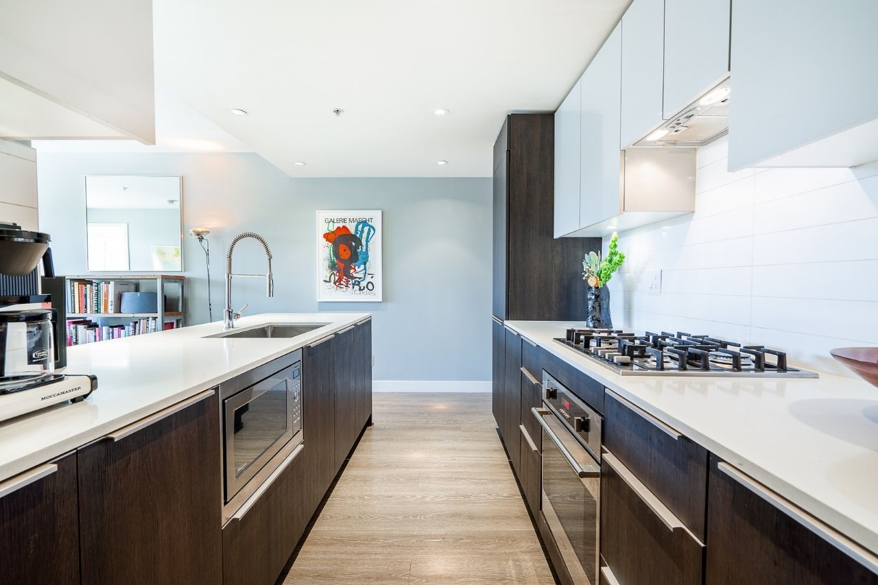 Experience the epitome of urban living in this unique 1 bed + den condo at The Boheme, nestled in vibrant East Vancouver. This corner-end unit boasts high ceilings and is located on the quiet side of the building, offering tranquility amidst the city buzz. The bright and spacious layout includes a generously sized bedroom, an office, with a partial view of the North Shore mountains that can double as a junior second bedroom, and an extra flex room. The open living and dining area seamlessly integrates with the chef's kitchen, featuring quartz countertops, integrated appliances, and modern cabinetry. Step outside to your private 214sqft sun-drenched patio which includes a mature, irrigated garden...perfect for morning coffee or evening relaxation. Enjoy the convenience of amenities such as a fitness center, party room, and outdoor courtyard with a playground. This excellent building, still under warranty, and the condo comes with secure parking and storage. Centrally located on the Mclean bike route, you're just steps away from the best restaurants, breweries, and shopping in Hastings Sunrise and Commercial Drive, offering the best value in East Vancouver's vibrant lifestyle.